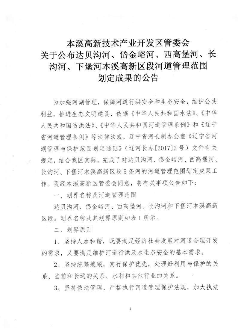 索引號: gxjscykfq-2020-00145 發布機構: 高新技術產業開發區 信息名稱: 本溪高新技術產業開發區管委會關于公布達貝溝河、岱金峪河、西高堡河、長溝河、下堡河本溪高新區段河道管理范圍劃定成果的公告 主題分類: 生態環境 發布日期: 2020-11-12 成文日期: 2020-11-12 廢止日期: 文 號: 關鍵詞: 本溪高新技術產業開發區管委會關于公布達貝溝河、岱金峪河、西高堡河、長溝河、下堡河本溪高新區段河道管理范圍劃定成果的公告 發布時間:2020-11-12 14:30:12 【字體:小 大】