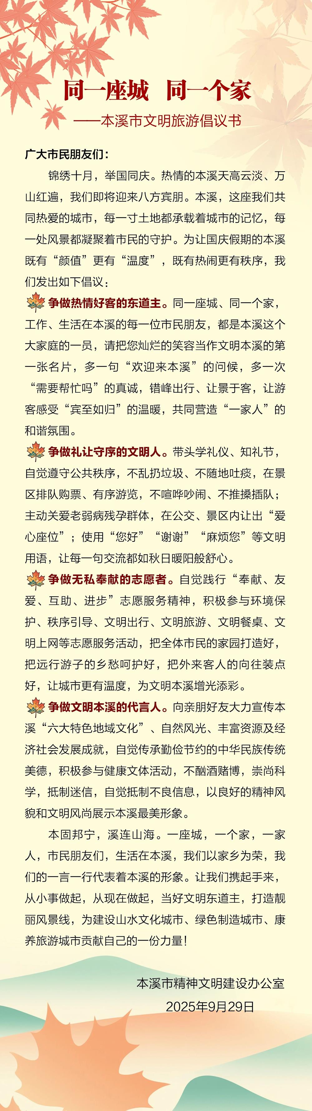 同一座城 同一個家——本溪市文明旅游倡議書