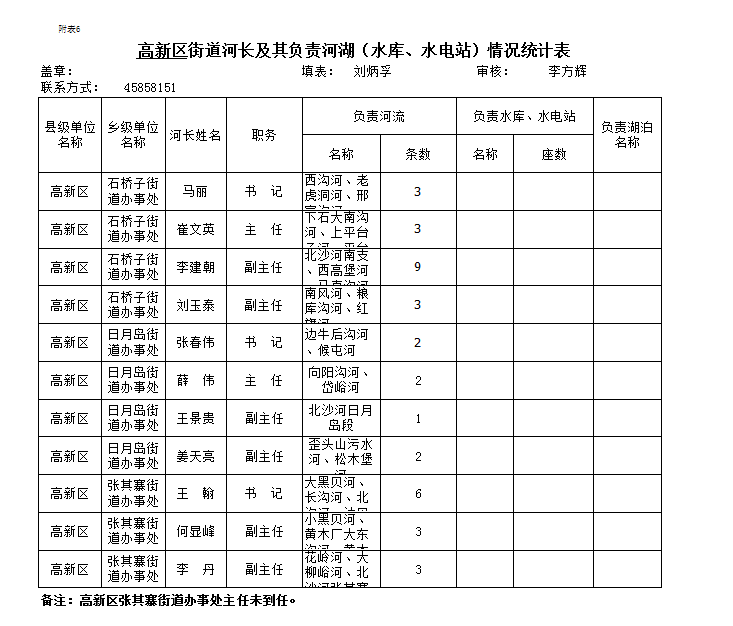 高新區街道河長及其負責河湖(水庫、水電站)情況統計表