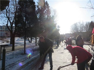 明華社區(qū)組織志愿者義務(wù)勞動(dòng)清理公園冰雪路面