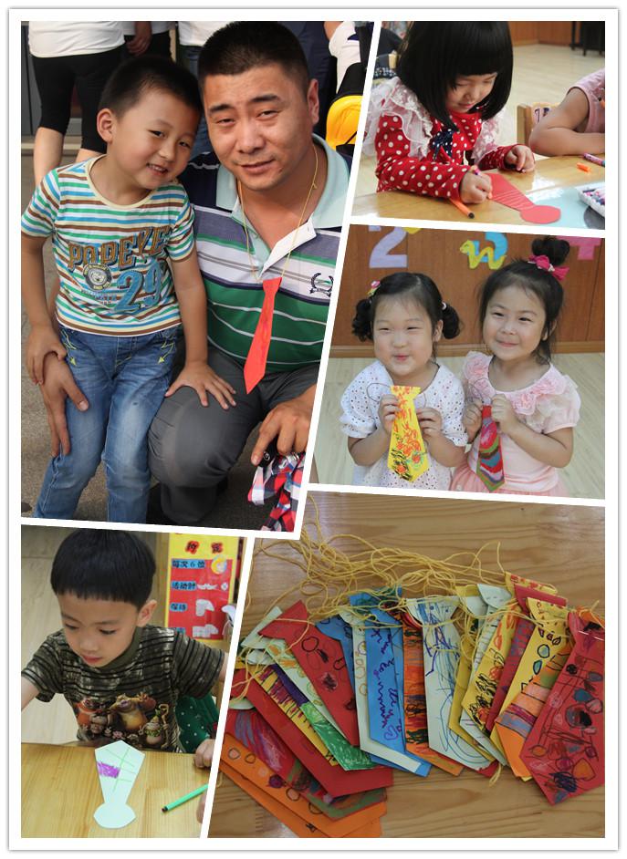 大班幼兒用自己在家幫助家長做一些力所能及的事所賺來的零用錢,去超市為爸爸精心挑選禮物:有給爸爸買牙刷的;有給爸爸買啤酒的;有給爸爸買鋼筆的……孩子們不僅向爸爸獻出了愛心,同時也完成了一次社會實踐活動,知道怎樣挑選物品,怎樣到收銀臺結賬,孩子們把平時在幼兒園學到的知識真正的運用到了日常生活當中。小班幼兒用小巧手為爸爸制作了時尚的領帶以及節日賀卡,雖不是昂貴的禮物,但每件作品都充滿著孩子們濃濃的愛意。離園時,當孩子們把自制的賀卡、親自精選的禮物送給來園接他的爸爸時,父親驚喜的表情證明了這些禮物是多么的珍貴而美麗。當孩子們說著“祝爸爸節日快樂!”“爸爸我愛你”……那一句句天真的祝福語,讓爸爸們感受到了自己在孩子成長中的重要性?!?br> 本次活動既使幼兒懂得了感恩,知道要愛自己的父母,也使男性家長增強了肩負對子女教養責任的意識,同時,更加增進了濃濃的親子情感。