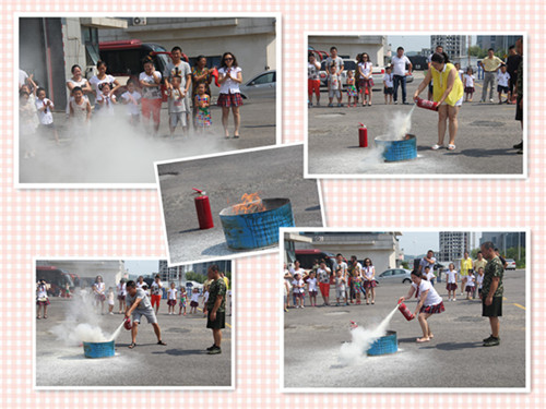 接著,消防員叔叔向小朋友們介紹了消防車輛和一些消防救生器材,并詳細地介紹器材設備的具體用途。為了讓孩子及家長對消防安全的重要性有更深一步的認識,消防員叔叔現場進行使用滅火器滅火展示,家長和老師們也勇于嘗試,在消防員的指導下進行滅火體驗。
