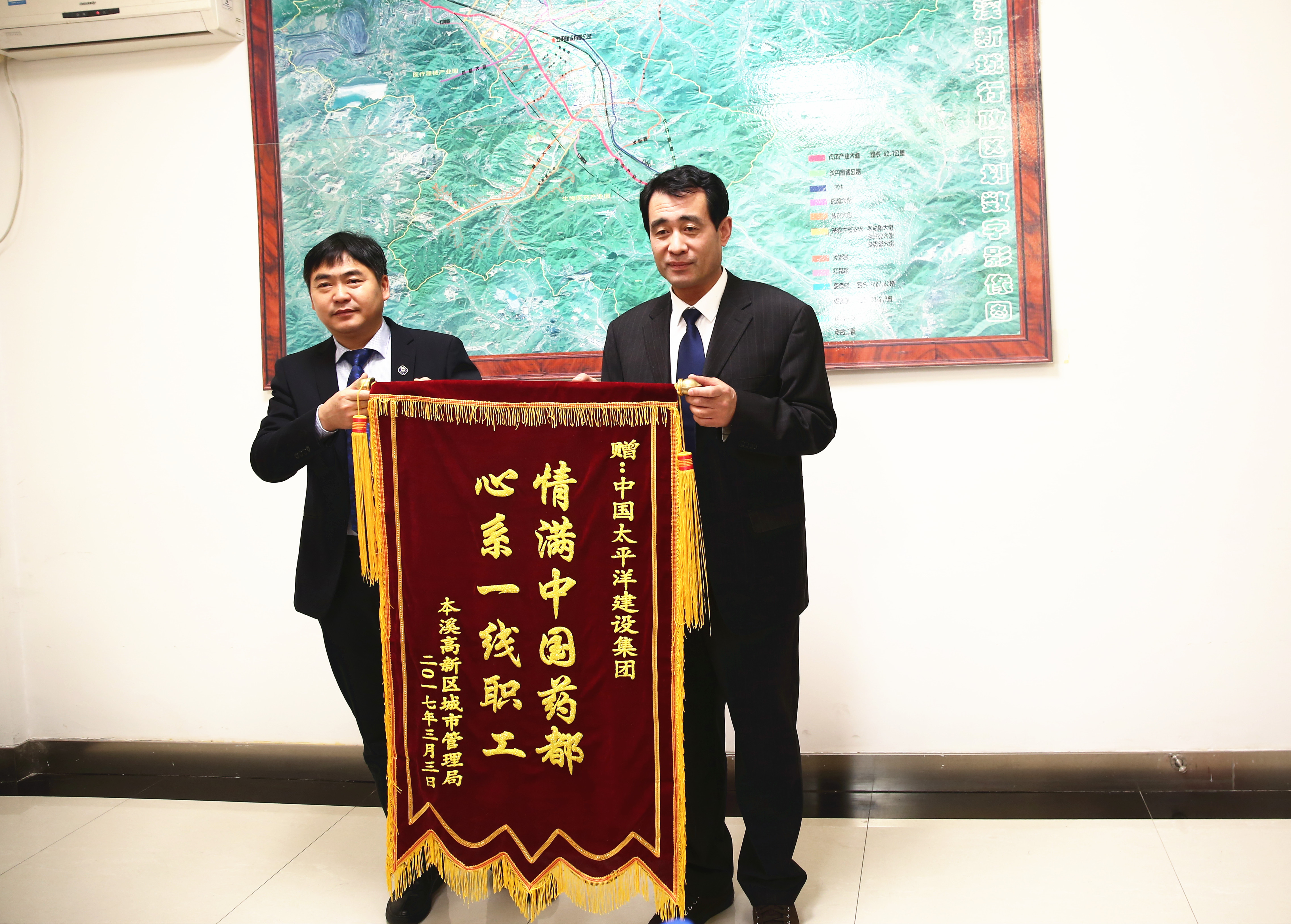3月3日,太平洋第十一建設集團總裁王姝晗、集團駐高新區項目負責人鐘玉金、工程中心總經理李進明一行到高新區城市管理局,將10萬元慰問金捐贈給一線環衛職工。城市管理局將印有“情滿中國藥都,心系一線職工”字樣的錦旗贈予該集團,以表達感激之情。