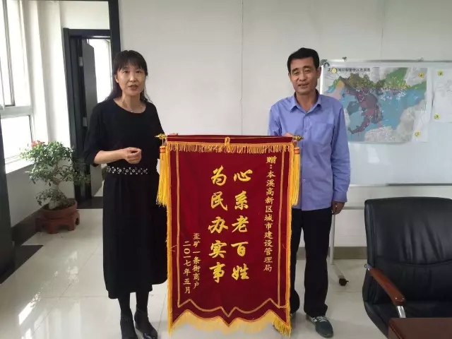 5月22日,日月島街道辦事處振興社區及歪礦一條街商戶代表,將印有“為民辦實事,心系老百姓”字樣的錦旗贈予高新區城市管理局,以表達對該局及時維修歪礦一條街污水管網,切實解決管網堵塞,改善周邊環境的感激之情。