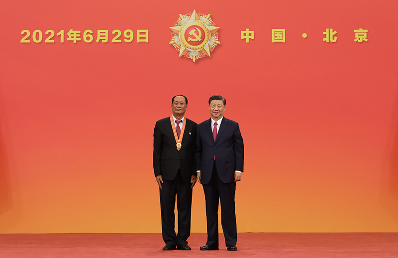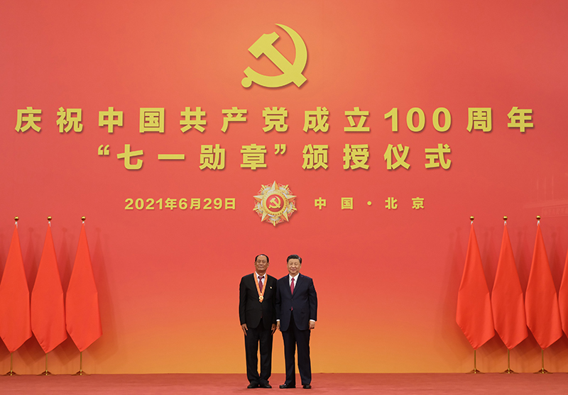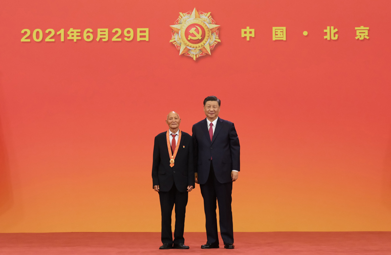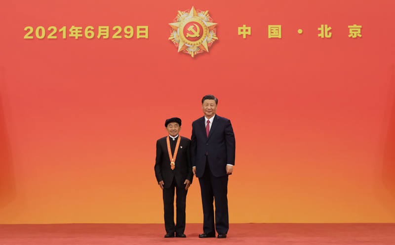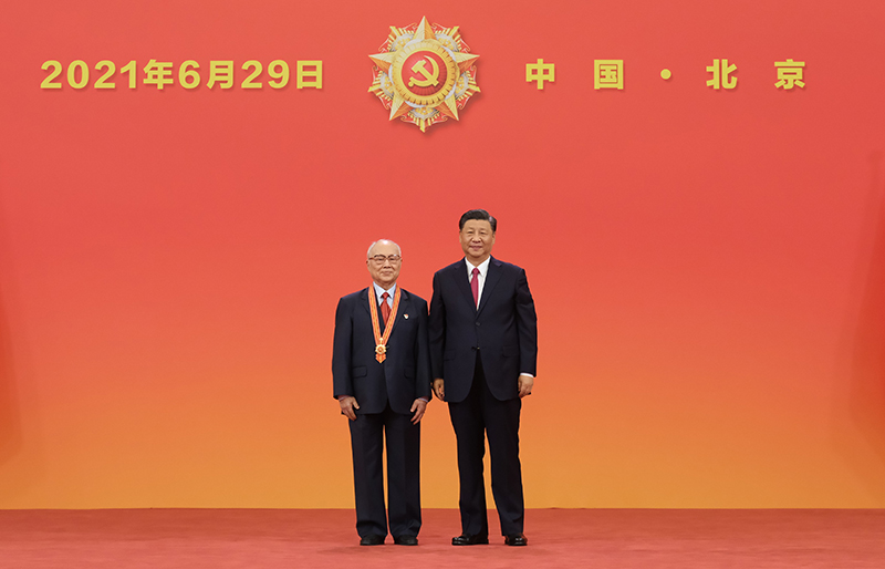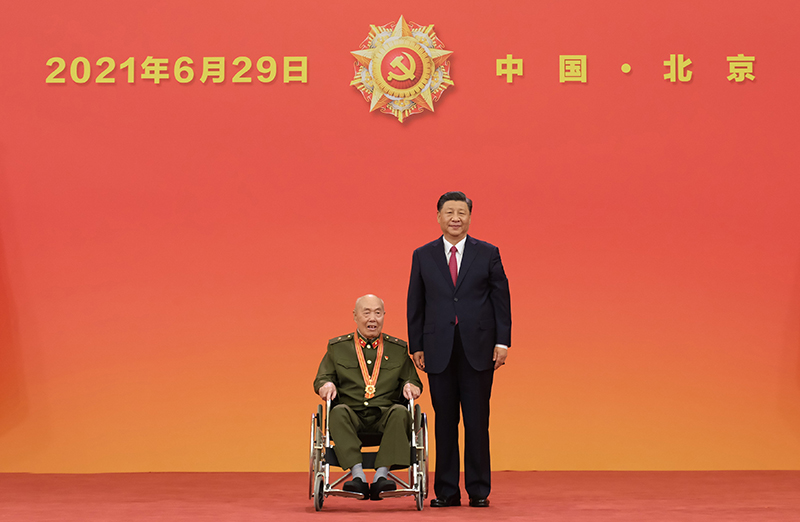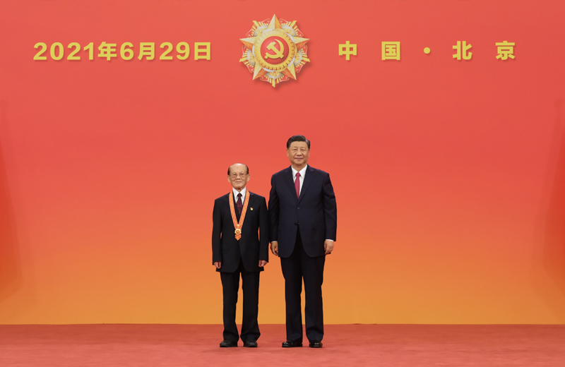 6月29日,慶祝中國共產黨成立100周年“七一勛章”頒授儀式在北京人民大會堂金色大廳隆重舉行。中共中央總書記、國家主席、中央軍委主席習近平向“七一勛章”獲得者崔道植頒授勛章。新華社記者 李學仁 攝