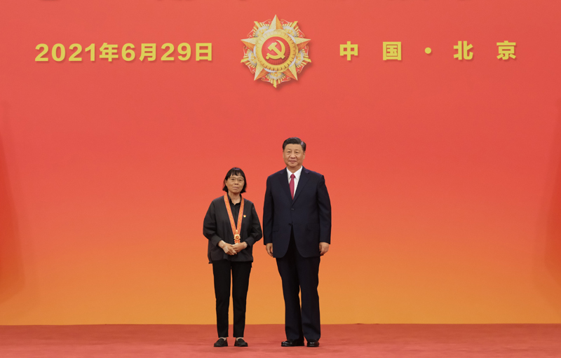 6月29日,慶祝中國共產黨成立100周年“七一勛章”頒授儀式在北京人民大會堂金色大廳隆重舉行。中共中央總書記、國家主席、中央軍委主席習近平向“七一勛章”獲得者張桂梅頒授勛章。新華社記者 李學仁 攝