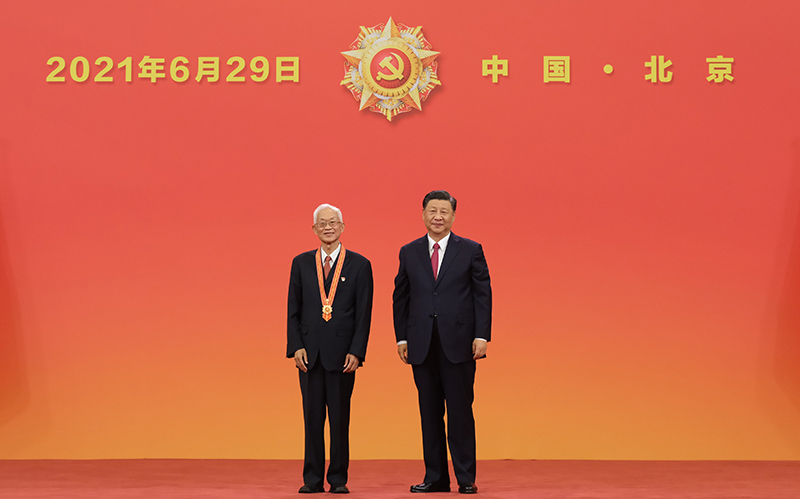 6月29日,慶祝中國共產黨成立100周年“七一勛章”頒授儀式在北京人民大會堂金色大廳隆重舉行。中共中央總書記、國家主席、中央軍委主席習近平向“七一勛章”獲得者周永開頒授勛章。新華社記者 李學仁 攝