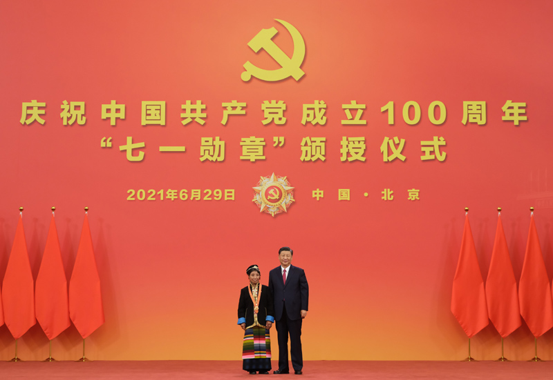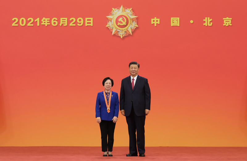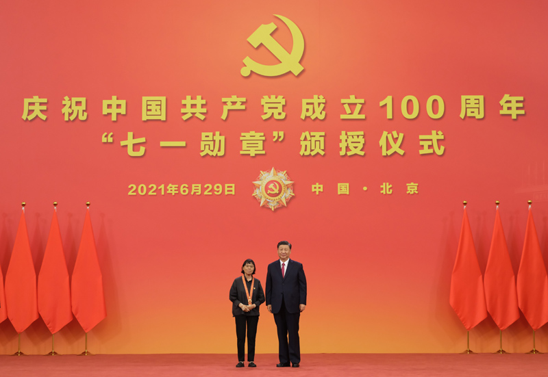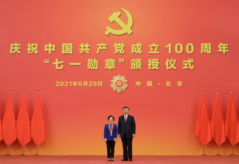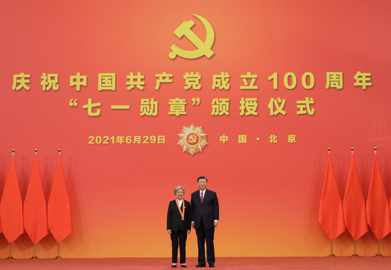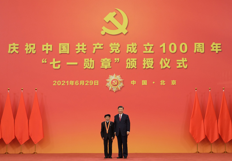 6月29日,慶祝中國共產黨成立100周年“七一勛章”頒授儀式在北京人民大會堂金色大廳隆重舉行。中共中央總書記、國家主席、中央軍委主席習近平向“七一勛章”獲得者馬毛姐頒授勛章。新華社記者 李學仁 攝