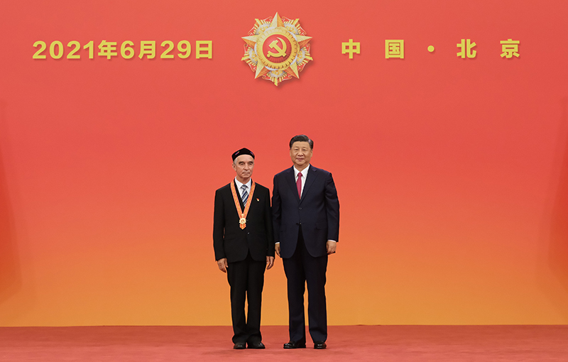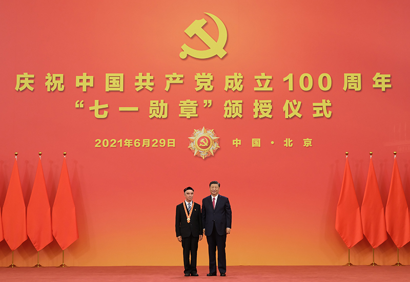 6月29日,慶祝中國共產黨成立100周年“七一勛章”頒授儀式在北京人民大會堂金色大廳隆重舉行。中共中央總書記、國家主席、中央軍委主席習近平向“七一勛章”獲得者買買提江·吾買爾頒授勛章。新華社記者 李學仁 攝