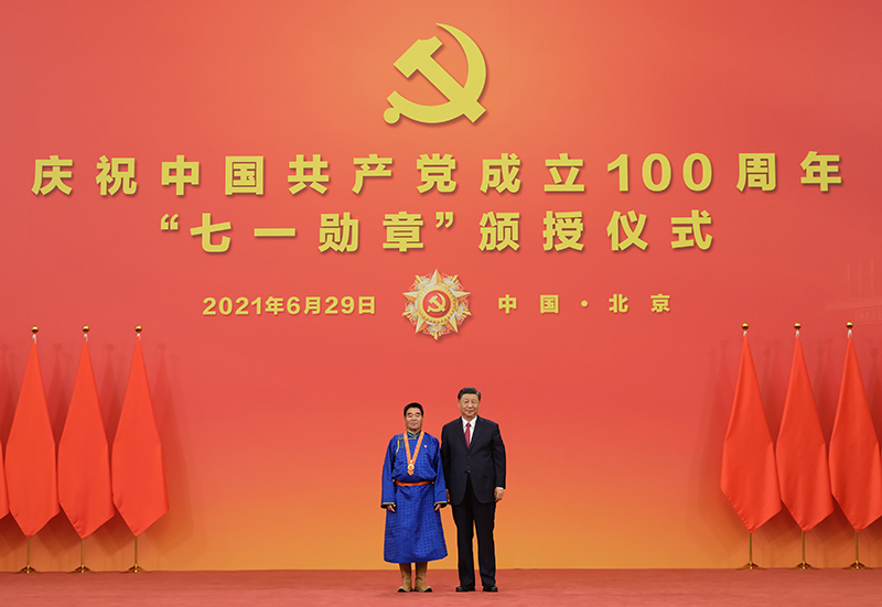 6月29日,慶祝中國共產黨成立100周年“七一勛章”頒授儀式在北京人民大會堂金色大廳隆重舉行。中共中央總書記、國家主席、中央軍委主席習近平向“七一勛章”獲得者廷·巴特爾頒授勛章。新華社記者 李學仁 攝